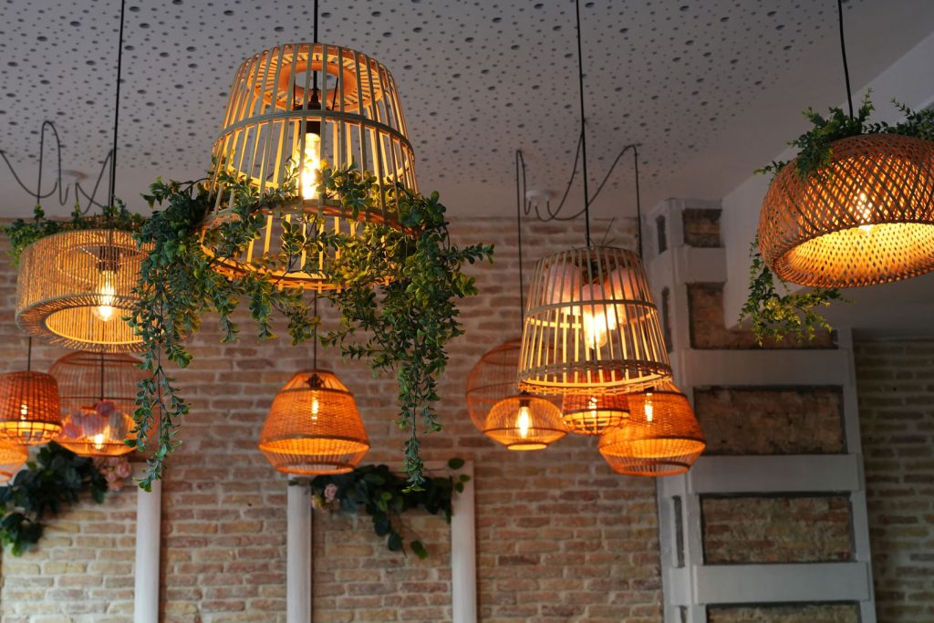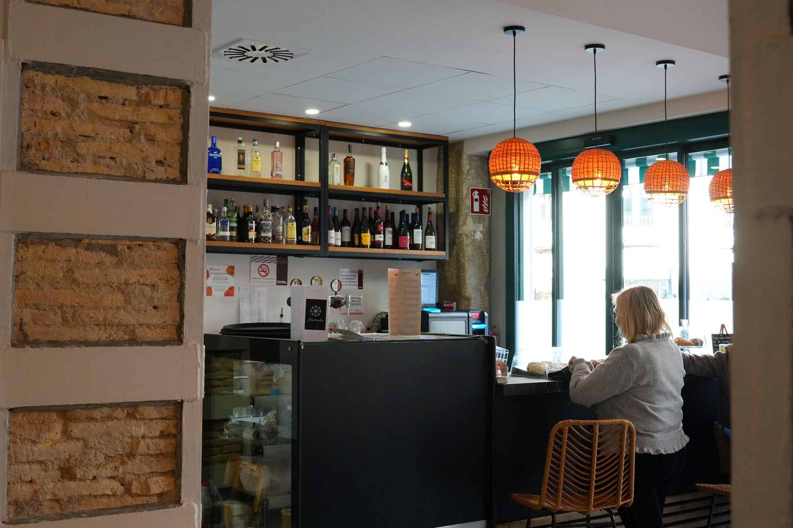 Desde la plaza, su toldo verde ya invita a entrar, combinando con su suelo ajedrezado en blanco y verde. En el interior, el ladrillo visto, las lámparas de materiales naturales y una cuidada selección de mobiliario crean un ambiente cálido y acogedor.